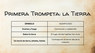 Las trompetas son utilizadas para anunciar diversos sucesos y juicios de Dios sobre el mundo. Cada trompeta anunciada por un ángel representa una plaga o castigo específico, son símbolos de los juicios de Dios.